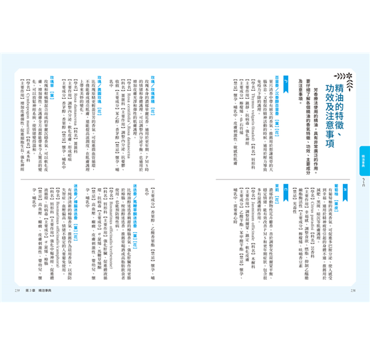 彙整介紹58種主要使用的精油,包括精油名稱、萃取部位,以及精油的詳細資訊(香氣、主要作用和成分、原產國、注意事項等)。各項以中文注音符號順序排列,也可以當作字典使用。