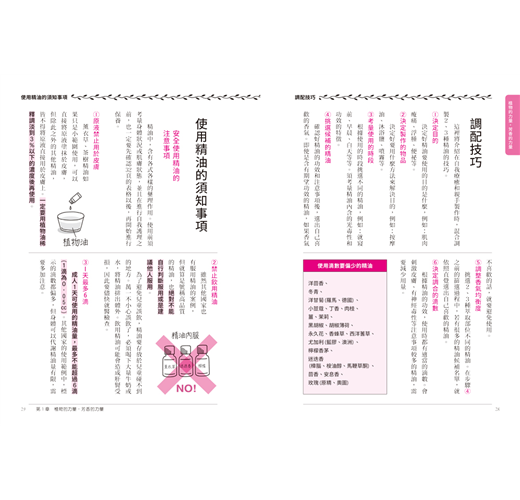 2. 內容詳細介紹了針對每種症狀推薦的精油,以及如何使用的方法。裡面有簡單易懂的插圖,除了精油以外,還介紹了皮膚和身體的相關知識,非常有幫助。