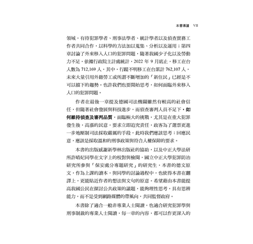 本書的出版感謝新學林出版社的協助,以及中正大學法研所許晴妃同學在文字上的校對與檢閱,國立中正大學犯罪防治研究所參與「保安處分專題研究」的研究生,本書的德文原文,作為上課的讀本,與同學的討論過程中,也使得本書在翻譯上,更能貼近作者的想法與文句的原意。希望藉由本書能提高我國公民在探討公共政策的議題,能夠理性思考,具有思辨能力,而不是受到網路媒體的帶風向,共同監督政府。