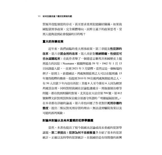 近年來,我們面臨的重大刑事政策,第三章提及性犯罪的改革、第六章罰金刑的改革、第八章針對精神障礙、性侵犯可否永遠關起來:在此作者舉了一個德意志聯邦共和國歷史上服刑最久的囚犯:Neumann,被關押超過59年,1962年1月13日因謀殺入獄,一直到2021年3月獄釋。當然這是一個極端的例子,原則上,依德國法,判處無期徒刑之人可以在服刑滿15年獲得假釋的機會,也提到2010年58位被判處無期徒刑之人,有50人出獄3年內沒有再犯;其他8人至今僅有6人因為輕罪判處罰金刑,同時對照我國在討論監護處分、刑後強制治療等問題,都有找到相關的對策,尤其是在大法官第799號、第812號解釋文針對刑罰與保安處分須遵守所謂的「明顯區隔原則」,在本章都有詳細的論述。第六章也回應了作者對於死刑存廢的態度,提出二點反對死刑存置的理由:無法達到嚇阻效果以及可能的誤判風險。