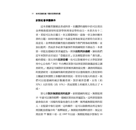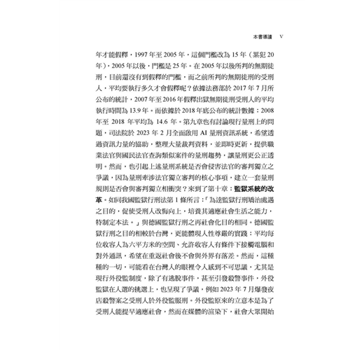 第七章對於無期徒刑的批評,依照德國的規定,無期徒刑15年就可以獲得假釋,德國民眾因而普遍認為,這些罪犯很快就會放出來,同樣的現象也發生在台灣,被判處無期徒刑的犯人,在監獄中執行達到一定的條件,是可以啟動刑法所定執行刑罰配套措施中的「假釋制度」。無期徒刑假釋的要件,規定在刑法第77條第1項,在1997年以前,無期徒刑最少要執行10年才能假釋,1997年至2005年,這個門檻改為15年(累犯20年),2005年以後,門檻是25年。在2005年以後所判的無期徒刑,目前還沒有到假釋的門檻,而之前所判的無期徒刑的受刑人,平均要執行多久才會假釋呢?依據法務部於2017年7月所公布的統計,2007年至2016年假釋出獄無期徒刑受刑人的平均執行時間為13.9年。而依據於2018年底公布的統計數據:2008年至2018年平均為14.6年。第九章也有討論現行量刑上的問題,司法院於2023年2月全面啟用AI量刑資訊系統,希望透過資訊力量的協助,整理大量裁判資料,並即時更新,提供職業法官與國民法官查詢類似案件的量刑趨勢,讓量刑更公正透明。然而,也引起上述量刑系統是否會侵害法官的審判獨立之爭議,因為量刑牽涉法官獨立審判的核心事項,建立一套量刑規則是否會與審判獨立相衝突?來到了第十章:監獄系統的改革。如同我國監獄行刑法第1條所言:「為達監獄行刑矯治處遇之目的,促使受刑人改悔向上,培養其適應社會生活之能力,特制定本法。」與德國監獄行刑之再社會化目的相同。德國監獄行刑之目的相較於台灣,更能體現人性尊嚴的實踐:平均每位收容人為六平方米的空間、允許收容人有條件下接觸電腦和對外通訊,希望在重返社會後不會與外界有落差。然而,這種種的一切,可能看在台灣人的眼裡令人感到不可思議,尤其是現行外役監制度,除了有逃脫事件,甚至引發殺警事件,外役監獄在人選的挑選上,也呈現了爭議,例如2023年7月爆發夜店殺警案之受刑人於外役監服刑。外役監原來的立意本是為了受刑人能提早適應社會,然而在媒體的渲染下,社會大眾開始質疑外役監制度的存在,甚至要求重刑犯能關好關滿。如果我國監獄刑事政策,完全媒體導向,民粹主義下的政策思考,受刑人能夠達到社會復歸的目的嗎?