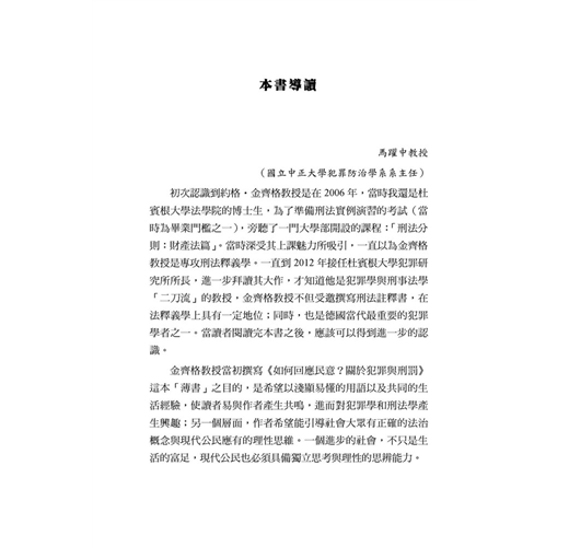 初次認識到約格・金齊格教授是在2006年,當時我還是杜賓根大學法學院的博士生,為了準備刑法實例演習的考試(當時為畢業門檻之一),旁聽了一門大學部開設的課程:「刑法分則:財產法篇」。當時深受其上課魅力所吸引,一直以為金齊格教授是專攻刑法釋義學。一直到2012年接任杜賓根大學犯罪研究所所長,進一步拜讀其大作,才知道他是犯罪學與刑事法學「二刀流」的教授,金齊格教授不但受邀撰寫刑法註釋書,在法釋義學上具有一定地位;同時,也是德國當代最重要的犯罪學者之一。當讀者閱讀完本書之後,應該可以得到進一步的認識。