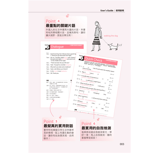 書中模擬日常生活中最常見的擬真情境,配上有趣生動的會話,讓你有如身歷其境,熟悉使用timing及方式!