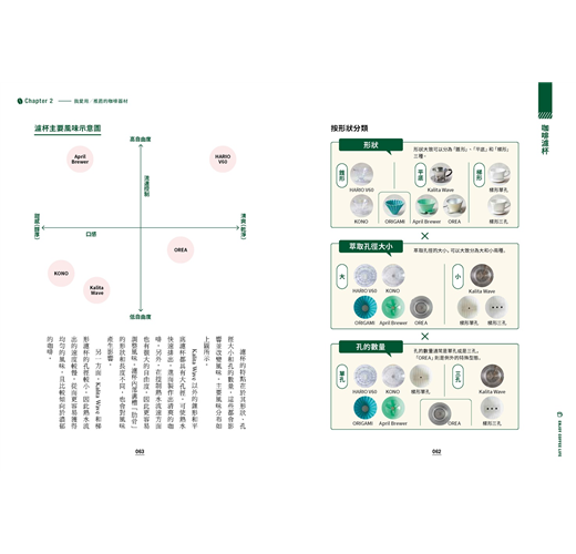 拿下比賽冠軍,只是粕谷哲進入創作設計的起點,作者先是分析市面上多款咖啡濾杯,並以自由度為縱軸,口感為橫軸,為讀者們提供更清晰的模組來理解不同濾杯的沖煮特色。緊接著分享自身開發的多款咖啡器材,完整貫穿從沖煮到品飲的體驗。見證了一連串透過不斷探索、嘗試開發和積極分享,保持頂尖進步的原動力。