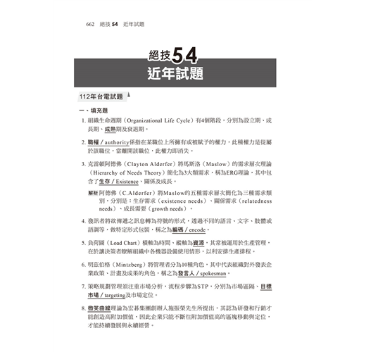 針對各主題選錄重要選擇題,並分為基礎、進階題目,讀完各章重點後,可以搭配練習。測驗自己真的理解課文內容了嗎?若是答錯題目過多,代表自己對這章節不夠熟悉,要額外加強複習。而實戰大進擊收錄國民營考試,如台電、台糖、台酒、自來水、中油、農會、中華電信、經濟部、中華郵政、桃園機場、桃園機場捷運等10幾種試題,你只要手拿著原子筆和2B鉛筆,手起筆落、一題一題將國民營試題從2014年一路寫到2023年,練習個千百回,透過大量的試題練習,不管題目怎麼出,你必定能在考場輕鬆破題!