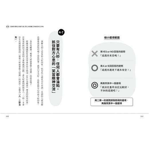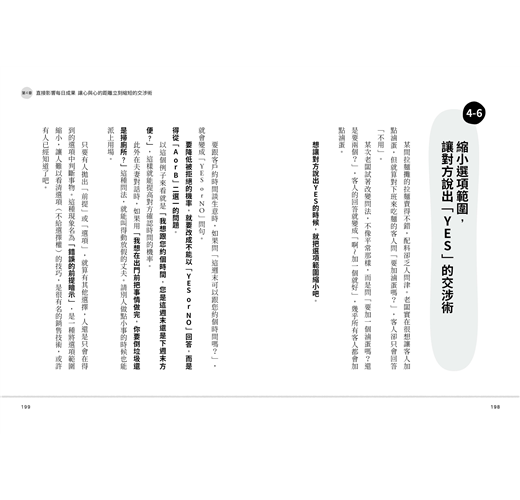想讓對方點頭答應時,最好不要用「是或否」的問題,而是使用「A或B」的二選一,人在遇到有前提或選項的問題時,很容易會不自覺從選項中選擇,因此所有選項都要安排對自己有利的內容。