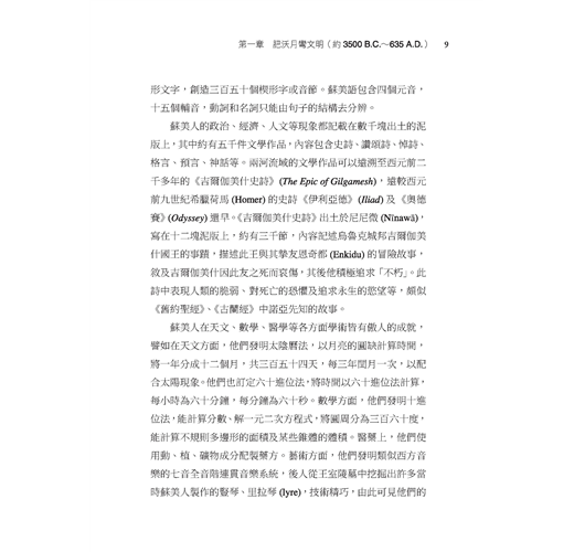 兩河流域的人民,自古雖飽受幼發拉底河與底格里斯河氾濫所苦,卻能憑藉洪水沖積後的肥沃土壤,創造出歷史上最古老的農耕文明之一。城邦四立、王國興起,以及隨之萌發的人類智慧基石:宗教、文字、神話、數學、天文、醫學……「美索不達米亞」不只是地理名詞,更代表古老文明的黎明時分。