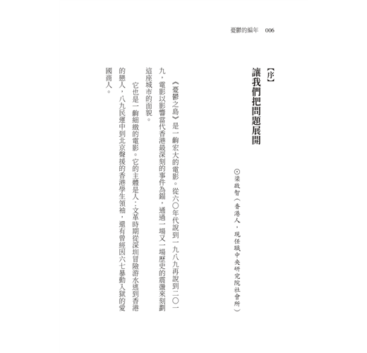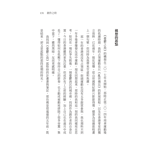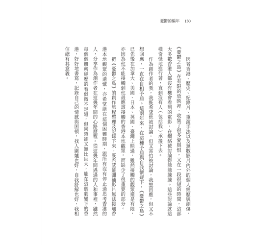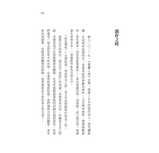 、拍攝方式的考量、「重演」手法的挑戰及他的思考,還有面對紛雜的素材如何剪輯等等。導演也探討了我們如何在所立足的這個當下回望過去╱歷史?如何解碼香港的離散宿命?而在本片拍攝期期間,香港社會發生巨變,讓這部原定為「後雨傘」的電影變成了「後一九」電影,導演又如何予以詮釋?本書最後並附有電影精選圖輯。
