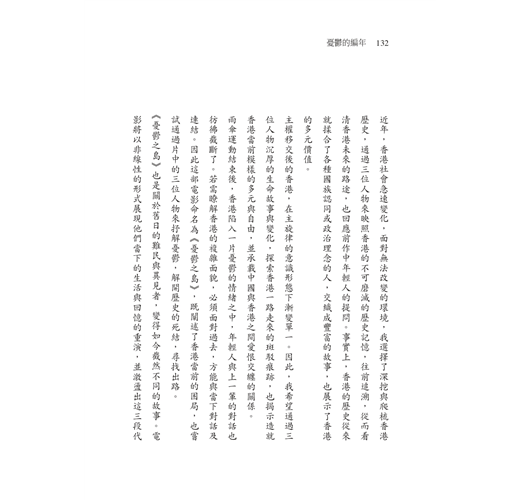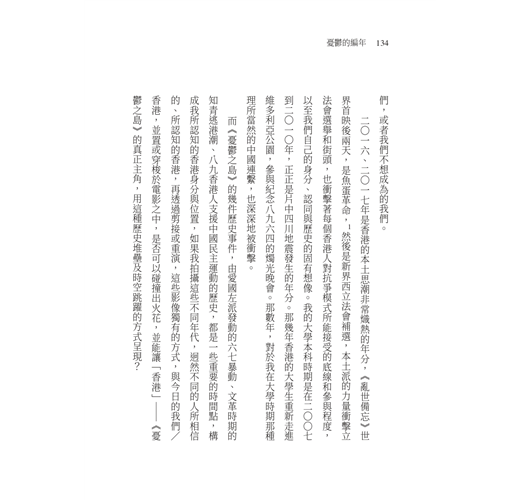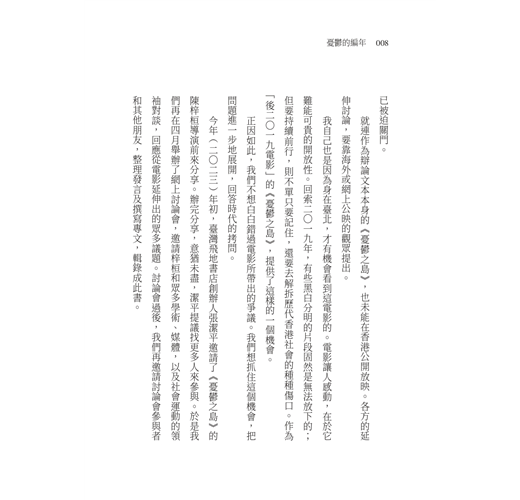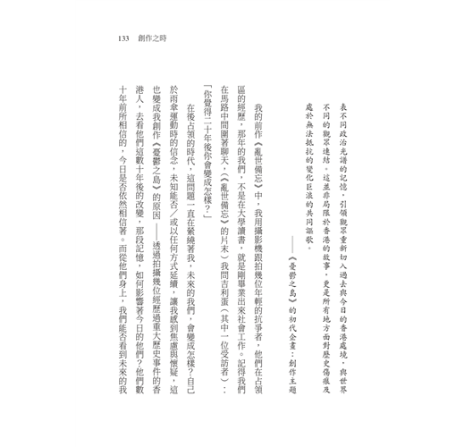 以此為輻射,在這本電影專書中有進一步延伸與討論。本書第一部從香港人的身分認同、社會運動的意義及其創傷、異議與堅持、對於左派青年的分析,以及紀錄片如何書寫歷史等面向,回應電影裡所拋出的諸多提問與時代難題。