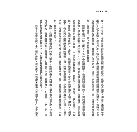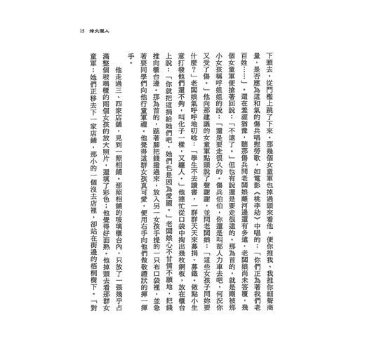 他看了看這女孩,十分端莊秀麗,便笑道:「怎麼又是傷兵老爺了哩?」小女孩低下頭去,從門檻上跳了下來。那幾個女童軍也掉過頭來看他,便你推我、我推你細聲商量,是否應為這和氣的傷兵唱慰勞歌,如電影《桃李劫》中唱的:「你們正為著我們老百姓……」 。還在羞澀猶豫,聽那傷兵問老闆娘離河邊還有多遠,老闆娘尚未答覆,幾個女童軍便搶著回說:「不遠了。」但也有說還是要走很遠的。那為首的,就是剛被那小女孩稱呼姐姐的說:「還是要走很久的。傷兵伯伯,你還是叫部人力車去吧,何況你又受了傷。」他向那建議的女童軍點頭說了聲謝謝,並問老闆娘:「這些女孩子問妳要什麼?」老闆娘氣呼呼地叨唸:「學生不去讀書,一群群天天來募捐、募鐵。做點小生意打發他們還不夠,叫化子一樣,又纏人。」他連忙從口袋中掏出幾枚銅板,放在櫃台上說:「你就把這捐給她們吧,她們也是因為愛國。」老闆娘心不甘情不願地,把錢推向櫃台邊。那為首的,踮著腳把錢撥過來,放入另一女孩手提的一只布口袋裡,並急著要同學們向他行童軍禮。他覺得這群女孩真可愛,便用右手向他們做敬禮狀的揮一揮手。