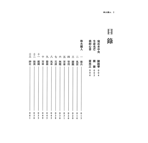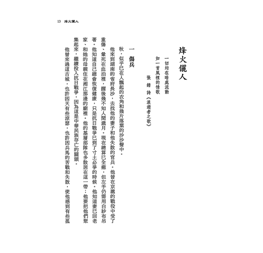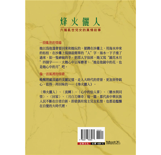 〈烽火儷人〉一篇,作者敘述自己一段難忘的感情,與孫立人將軍在大時代的感情,雖然礙於世俗眼光,情遷此時才公開,作者卻是下定很大的決心,才動筆留下這一段亂世的美麗回憶。深具歷史性與深情的代表作,值得一起走入大時代的背景之中,慢慢品味。