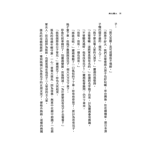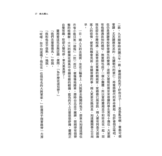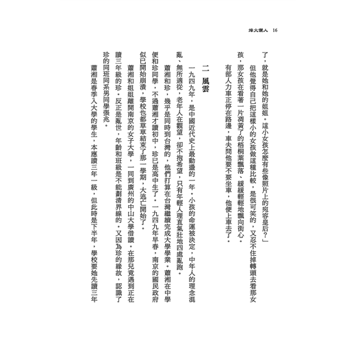 蕭湘是春季入大學的學生,本應讀三年一級,但此時是下半年,學校要她先讀三年二級,九月開學時再讀三年一級。蕭湘因此笑了好些日子――真是亂世啊,書都可倒著讀,尤其讀歷史系的,先讀朝代的衰亡,再看那朝代的革命興起,也許會很乏味吧,但仍是感謝學校對借讀生的變通。這時又發現從南京來借讀的學生竟有十幾位,大家頗有他鄉遇故知的親切,無意間也成了一個小團體,所以當時蕭湘並不和珍走在一起,而現在卻在台灣相遇,又都寄居在軍屬的親戚家,家鄉都已無音訊,兩人便有同是天涯淪落人的悲情,便常找機會見面,有關借讀的事,兩人更要交換消息,知道離開學之日尚早。