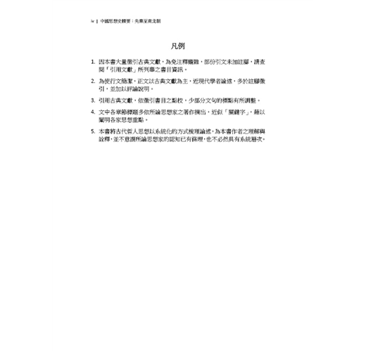 幾經嘗試,數易其稿,最後立定幾項原則。其一,以文獻為主,理解與詮釋皆依文獻,儘量讓文獻自我解釋,近於「以孔解孔」、「以莊解莊」,其後再舉證後世注解與現代詮釋,並提出個人觀點。其二,章節標題盡可能以文獻中的原文標示,可以突顯文獻的關鍵詞,也方便讀者掌握重點。其三,引用論著多置於註腳,除了使本文簡明,也能區別原始文獻與學界的詮釋論述。其四,徵引出土文獻,藉由考古研究,補充各個專題的文獻資料,更全然地展示思想史的面貌。第五,把握思想史的歷時性與共時性,敘述學派與概念的前後發展,也比較同時期的相異觀點。思想史是流動且交錯進行的,涉及歷史、地理以及政治等背景,各個領域相互關聯與影響,思想家對人生與現實問題提出的解答,本書寫作時盡可能加以呈現。牟宗三先生曾論及為什麼研究中國哲學需特重文獻,他認為相較於西方哲學,中國古代哲學家「不是很注重系統,並不是邏輯的入路,他們的著作文獻,固然蘊涵很深刻的見解,但因為不重系統,不是問題性的思考入路,則他們的見解必須對文獻作正確的了解,然後可以見到。……所以寫一本中國哲學史必須引證相當多的文獻,而且扣緊文獻來疏解。」(〈研究中國哲學之文獻途徑〉)牟先生之說,是本書寫作的宗旨,引證文獻,依文獻疏解,務求論述有所憑據。