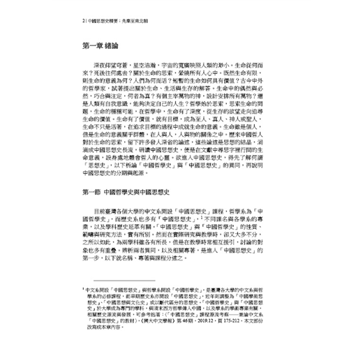 深夜仰望穹蒼,星空浩瀚,宇宙的寬廣映照人類的渺小。生命從何而來?死後往何處去?關於生命的思索,縈繞所有人心中。既然生命有限,則生命的意義為何?人們為何而活?短暫的生命如何具有價值?古今中外的哲學家,試著提出關於生命、生活與生存的解答。生命中的偶然與必然,巧合與注定,何者為真?有個主宰萬物的神,設計安排所有萬物?還是人類有自我意識,能夠決定自己的人生?哲學始於思索,思索生命的問題,生命的種種可能,在哲學中,生命有了深度,從生存的欲望走向追尋生命的價值。生命有了價值,就有目標,成為至人、真人、神人或聖人,生命不只是活著,在追求目標的過程中成就生命的意義。生命雖是個人,但是生命的意義關乎群體,在人與人,人與物的關係之中。歷來中國哲人對於生命的思索,留下許多發人深省的論述,這些論述是思想的結晶,涓滴成中國思想史長流,研讀中國思想史,便是在文獻中尋思字裡行間的生命意義,設身處地體會哲人的心靈。欲進入中國思想史,得先了解何謂「思想史」,以下析論「中國哲學史」與「中國思想史」的異同,再說明中國思想史的分期與起源。