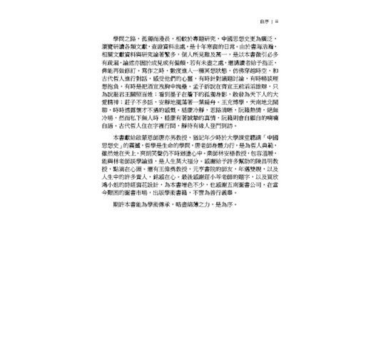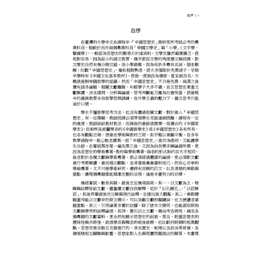 學生不懂哲學思考方法,也沒有讀過相關文獻,對於進入「中國思想史」有一定障礙,教師授課必須帶領學生克服這個困難。課程有一定的進度,教師設計教材教法,而課後的進修就需要一部適合的《中國哲學史》。目前所見前輩學者的《中國哲學史》或《中國思想史》各有所長,也各有觀點立場,但是在學術與教材之間,似乎難以兼顧平衡。在多年教學過程中,起心動念撰寫一部「中國思想史」,能作為教材,又能讓學生自修。在嘗試寫作第一編先秦之後,又因為自我要求與論證所需,更改為思想史的學術專著。教材與學術專著,兩者的形式和內容大不相同,後者對於各種文獻與學術專著,都必須經過嚴謹的論證,更必須對文獻進行考察解讀,進而提出觀點,並非僅是彙集資料而已。然而心目中的學術專著,又不只是學術研究,還得有流暢的行文,以及清楚的章節與重點,讓每個專題都能簡潔完整的呈現,這是本書努力的目標。