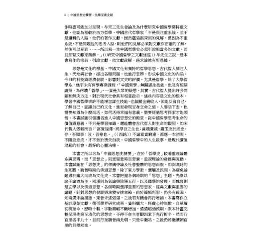 思想是文化的根基,中國文化有獨特的哲學思想,古代哲人關注人生、天地與社會,提出各種問題,也進行思辨,形成中國文化的內涵。今日的科技與經濟發展,影響對文史的評價,尤其是哲學。除了大學哲學系,幾乎未有哲學專業課程,「中國哲學」無關謀生技能,也沒有相關證照,為何讀「哲學」,一直是大眾的疑惑。其實,古代哲人提出許多問題和解決方法,對於現代社會具有相當啟示,這些內容是文化的根本。學習中國哲學或許不能增加謀生技能,也無關金錢收入,卻能反省自己,了解自己,認識自己的文化,進而發現安身立命之道。人要活下去,也需要知道為什麼而活,如何活得幸福有意義,需要經過思考探索才能領悟。本書試圖引領讀者進入中國思想史的殿堂,從中國哲學思考生命的價值與意義,不只是學習知識,還能體會古代哲人對生命的觀照,如宋代哲人張載所言:「富貴福澤,將厚吾之生也;貧賤憂戚,庸玉汝於成也。存,吾順事;沒,吾寧也。」(〈西銘〉)不論富貴窮達,都應一本初衷,不隨波逐流,才不致於喪失自我。中國哲學中的人生啟事,是現代價值混亂的社會,最好的心靈治療。