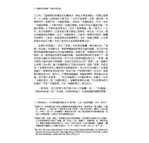 從學科角度視之,西方「哲學」有其研究範疇、歷史與方法,「哲學」的定義、內容與方法,是哲學概論或哲學史討論的起點。若以西方哲學的理論架構或論證方式討論中國學術,就會引發「中國是否有哲學」的疑問。此一疑問是民初學界爭論的焦點,為西學東漸的時代背景之下,帶有民族主義的中西對抗所致。若不以西方哲學規範其他文化,「哲學」應可視為人類求知的文明發展,各個文化都有自己的「哲學」。此一論題可以牟博(Mou Bo)編《中國哲學史》的說法為參考,他對「哲學」的認定為:「哲學對世界和人類的根本性問題探究,可以有不同的關注。在這個意義上,哲學所具有的批判性,使其不是一門封閉的學科,也沒有一個絕對的路徑或方法。基本上,只要能通過論證,辯論和解釋,對結論加以討論,就可視之為哲學。」 所以他編著以《中國哲學史》為書名,而非「中國思想史」或「中國宗教史」。這種對哲學的定義,不以哲學為西方所獨有,可使「中國哲學」乃至「中國哲學史」得以成立。