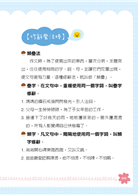 本書設定「我們這一家、生病、我的假期生活、假如我是○○○、趕走我的壞心情、我喜歡、我愛○季」七個寫作主題,介紹「類疊、轉化、排比、譬喻、感嘆、摹寫」等修辭法,搭配三大主題分區和六大學習重點,讓爸媽帶領孩子一步步學會寫作文。