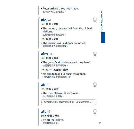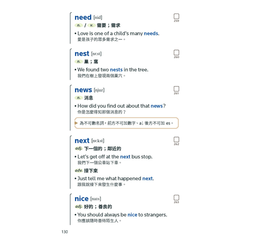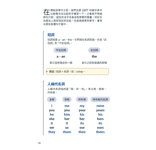 另外,官方公布的初級字表當中,有許多字像a、the、does等等偏文法功能的字,或是地名、數字、節日等較類似專有名詞的字。這些字我們都另外分出來,文法字就以簡單的文法規則最做介紹,而數字、星期、地名等等因為用法單純,所以就直接提供中文。將這些單字分出來另外介紹,才能讓讀者專注在有實質意義的單字上。