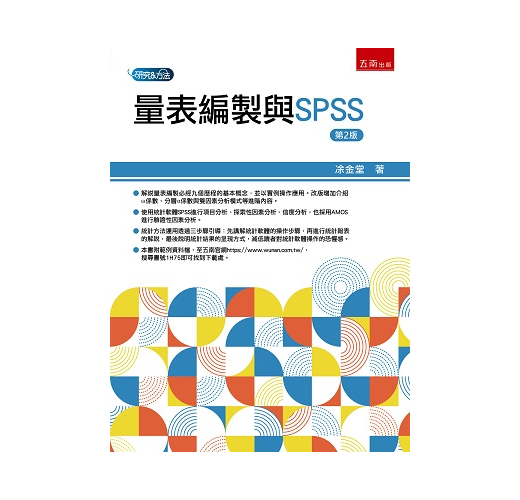 本書使用到的統計軟體,除了以SPSS進行項目分析、探索性因素分析、信度分析外,也採用AMOS進行驗證性因素分析。每種使用到的統計方法,都會先說明統計軟體的操作步驟,再進行統計報表的解說,最後說明統計結果的呈現方式,透過這三個步驟的引導,相信能減低讀者對統計軟體操作的恐懼感。