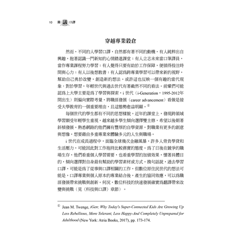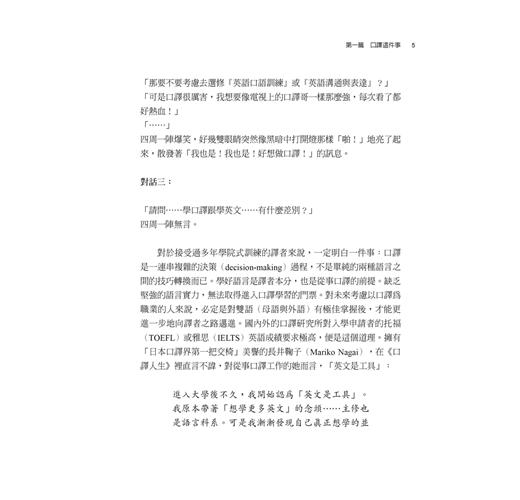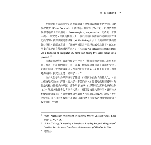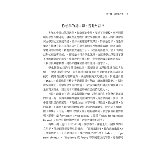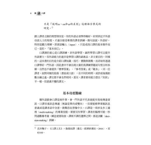 這是一本引導取向的口譯學習書,帶領門外漢踏入口譯這道大門,看看各類口譯的型態、試探要成為譯者的條件、嘗試運用不同的口譯技巧,再認識不同於會議口譯的社區(公共服務)口譯,最後觀望悄然而至的「人工」口譯(AI interpreting)會不會讓「工人」口譯(human interpreting)驀然而止。