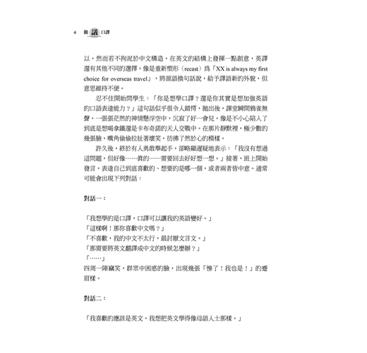 樂趣是最好的師傅。讀書的時候,對翻譯生出了興趣,覺得好玩、有意思,慢慢體悟到口譯跟筆譯之間的同與不同,耐人尋味。開始工作後,教書或翻譯,遇過一些人、見過幾處風景,直到現在。再次提筆書寫一本與翻譯相關的書籍,因為樂意,也因為對知識的熱情。