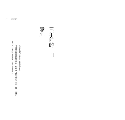 我打賭如果你親眼近距離看過馬術障礙賽,絕對會被感動。至於真正騎在馬背上,那又是另一種感覺了,刺激感與速度感有如在飛翔一般。然而三年前的一場意外,讓我和當時還是小馬的「閃電」倒地摔傷,我就再也沒騎馬了。