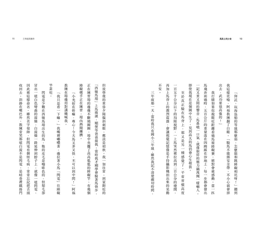 至於真正騎在馬背上,那又是另一種感覺了。平常習慣高度一百五十公分以下的侷限視野,一上馬突然被拉高到二百公分的遼闊,再加上馬背上的激烈震盪,會讓視覺記憶像是手持攝影機拍出來的晃動不安。