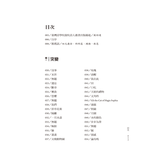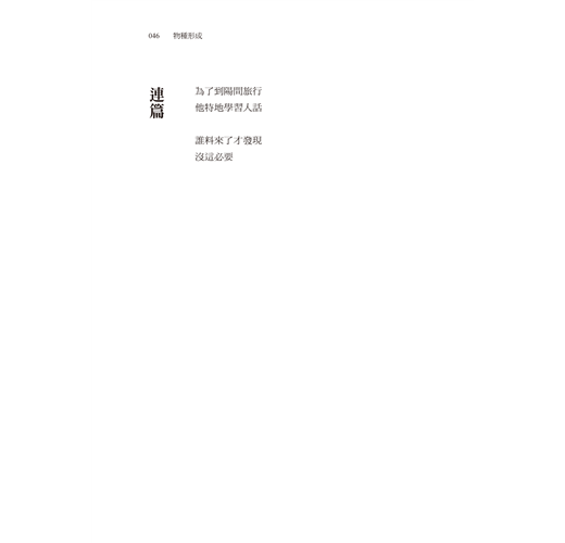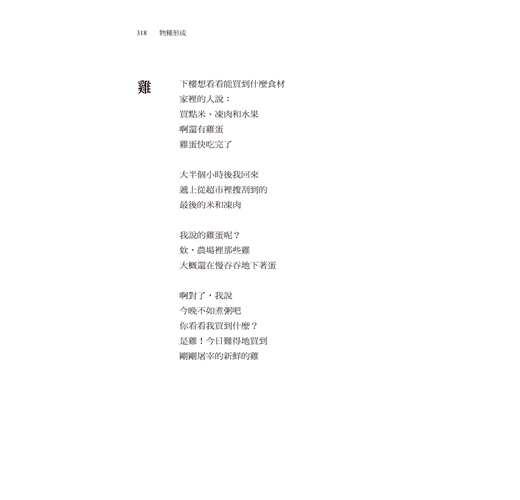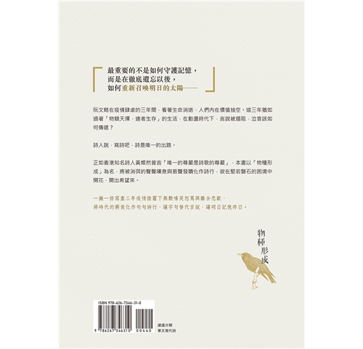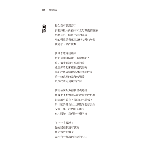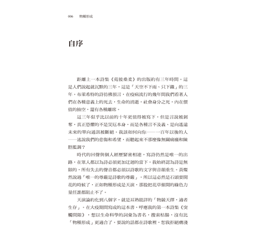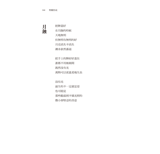 正如香港知名詩人黃燦然曾言「唯一的尊嚴是詩歌的尊嚴」,本書以「物種形成」為名,將被消弭的聲聲嘆息與振聾發聵化作詩行,欲在堅若磐石的困境中開花,開出希望來。
