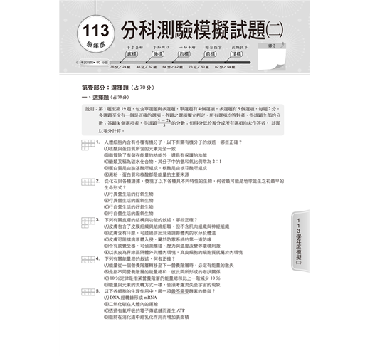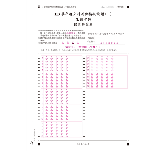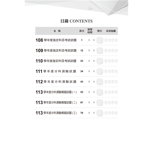 為了幫助同學們熟悉分科測驗的命題方式,特聘補教權威名師針對最新命題趨勢、網羅各類題庫,輔以Learning Analytics統計,編寫3回模擬試題讓學子們實戰演練,並輔以擬真的卷卡合一答案卷拉頁,提前熟悉應試作答的技巧,掌握得分關鍵,馳騁考場、傲視群雄!