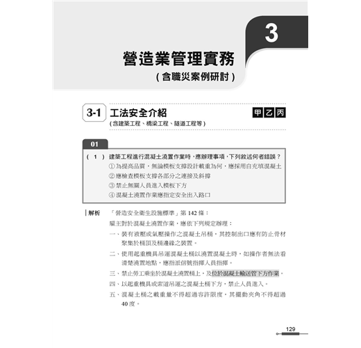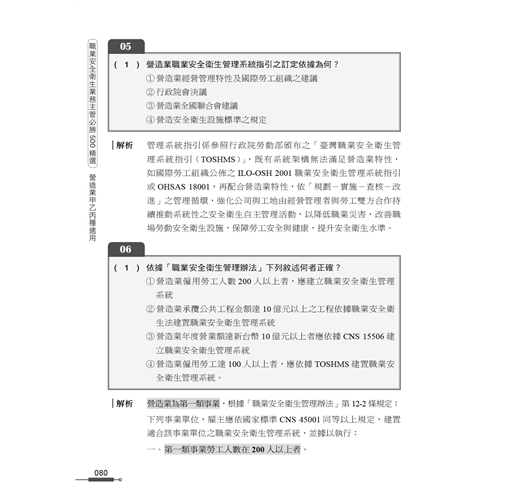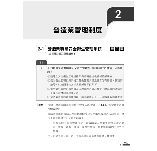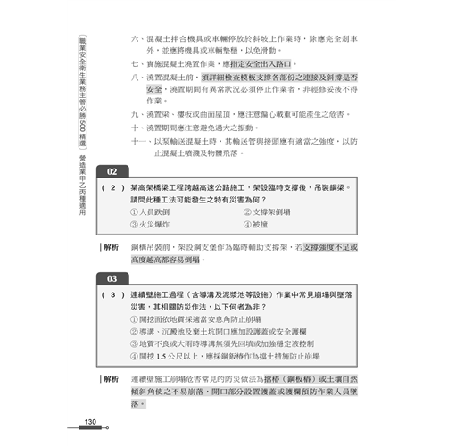 甲乙丙種職業安全衛生業務主管為電腦化測驗,測驗題庫不公開採四選一選擇題,進行電腦上機考試,題目將由電腦連線抽題80題。根據「職業安全衛生教育訓練規則」規定,營造業職業安全衛生業務主管訓練時數為甲種42小時、乙種35小時、丙種26小時;訓練內容包含「法規、管理制度與管理實務課程」,本書即採用此架構編寫,精選必考500題精華題目,將各個章節考題分類後撰寫詳細解析,提供最輕薄且最精華的內容,協助考生在有限的時間內,掌握答題方向及技巧,有效率的準備甲乙丙種職業安全衛生業務主管電腦測驗,輕鬆且順利通過考試取得證照。