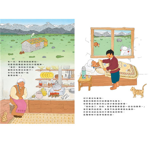 柔和的筆觸與色彩,勾勒出讓人心曠神怡的喜馬拉雅山區山景。也畫出雪巴人的住家、生活場景,透過圖畫就能了解雪巴人的日常。