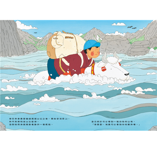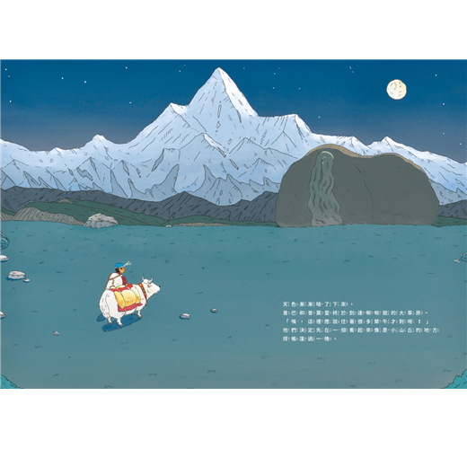 除了故事動人之外,要如何將高山遼闊的美景收納到書頁裡,也是讓人十分在意又期待的部分。梨木選擇了清爽的用色,以純熟的構圖將喜馬拉雅山的各種面貌都細細的展現眼前。——謝依玲/童書工作者
