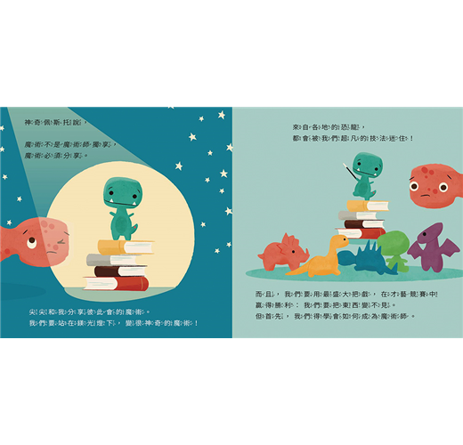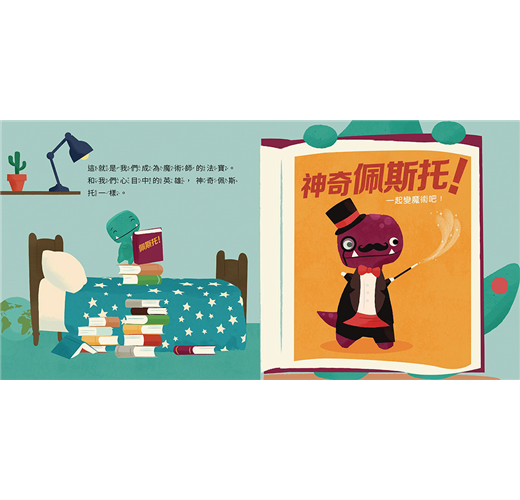 這種運用的反差手法,製造故事的戲劇效果和趣味性,不僅在《小小霸王龍最偉大的魔術》的故事中集了大成,也帶領閱讀的小小孩(其實也包括陪讀的大人),去思考和學習人生的重大課題。