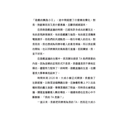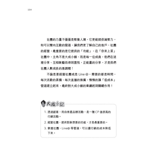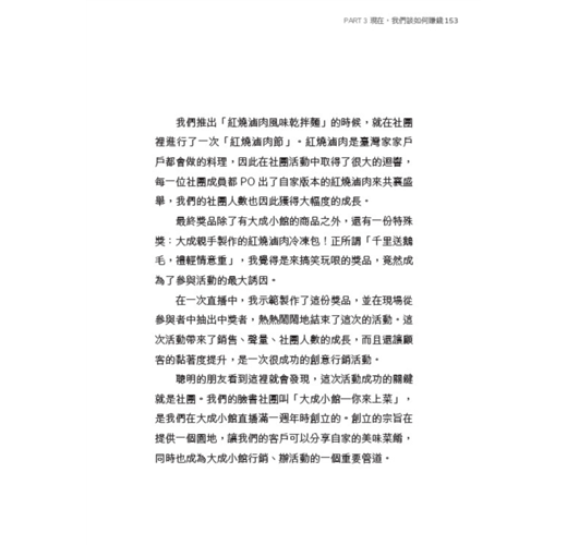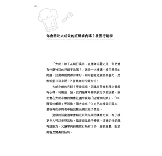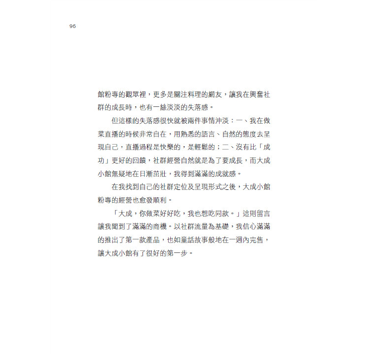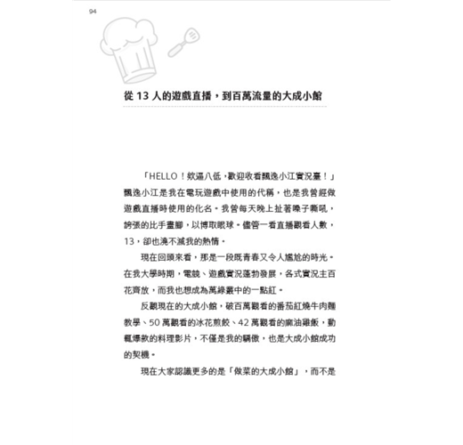 「哈囉大家好,歡迎收看每週三晚上八點,我的私廚是大成!」這句話我每週三晚上都說,已經說了三年,破百集。因為新冠疫情回到臺灣的我,「直播」成為了我生活、工作和休閒的一部分,也成就了現在的大成小館。本書中會介紹到如何從社群媒體、直播經營轉化成商業流量,最後創業形成自有品牌的完整過程跟心法。
