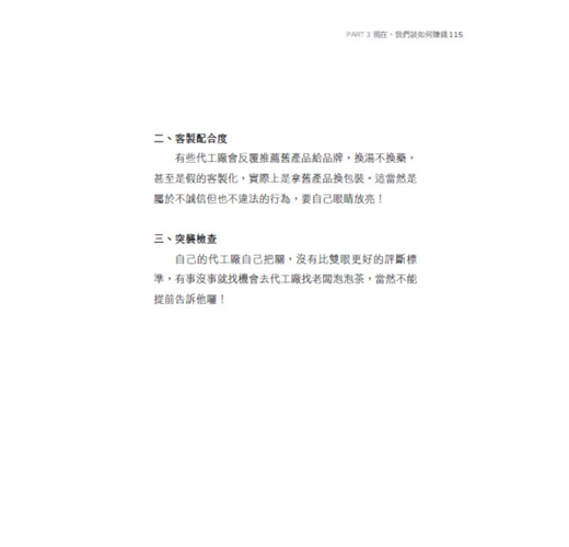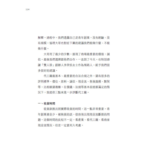 當然,除了經營品牌,創業中包含了方方面面,現金流斷裂破產、第一桶金哪裡來、奧客的客服、形形色色的代工廠……等,在書中我都會以個人的實際經歷進行分享與分析,相信對於想要創業、正在創業、考慮放棄創業(?)的年輕朋友們,都會有很大的幫助。