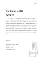 以燕王朱棣討伐明建文帝之「靖難之役」發生的1399 年為題,敷衍《太和正音譜》作者、王室成員朱權為其兄挾至北平,命寫檄文開始,繼之朱權與家班優伶合演《趙氏孤兒》貫穿全劇,暗喻其當下命運狀態,最後趙氏孤兒並未大報仇,徒留英雄成敗辯證予觀眾。能以靖難之役史事、北曲名家朱權事並巧妙結合元雜劇《趙氏孤兒》,真可說是季紋的神來一念。以史實為基,以藝術為心,戲裡戲外、古往今來,虛實呼應得自然生趣,同時保留五折一楔子的戲劇結構,四人串演十餘角亦頗具古味,尚且,多處改動原劇而有情理之中、意料之外的匠心安排,足見季紋的編劇功力。