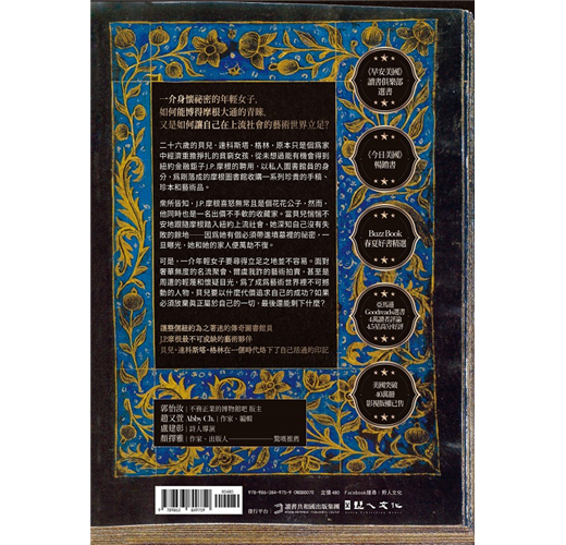 本書以歷史上管理J.P.摩根私人圖書館聞名的圖書館員──貝兒.達科斯塔.格林(Belle da Costa Greene)之真實人生為借鏡,書寫了貝兒以獨到細緻的選品和藝術眼光在紐約上流世界中嶄露頭角的祕密。這部作品不僅展現了藝品收藏世界的奇觀,更彰顯出一位女性穿梭於迥異文化間的韌性與機智。