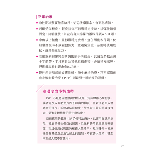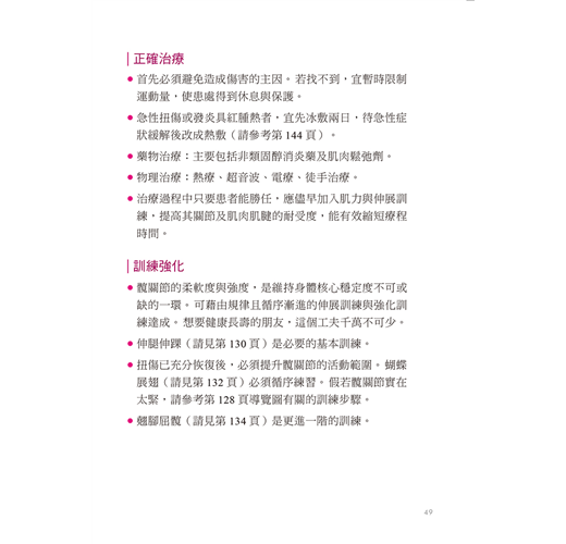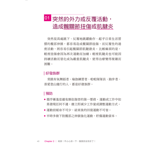 「腿」是人體的第二心臟,一旦雙腿痠疼、膝蓋無力,就是衰老的先兆,要想抗衰老,腿要夠有力。有鑑於此,本書特別收錄髖關節、膝關節與踝關節的疾病,例如髖關節扭傷、滑液囊發炎、髖部骨折、梨狀肌症候群、髂脛束發炎、髕骨軟骨炎、膝關節扭傷、十字韌帶斷裂、半月軟骨破裂、滑液囊發炎、退化性關節炎、足踝翻腳刀、足底筋膜炎、足跟脂肪墊損傷、大腳趾外翻、阿基里斯肌腱炎等20大常見病症,並按照身體部位來分章,方便讀者加深印象,快速找到對應位置。