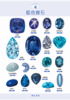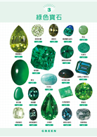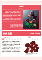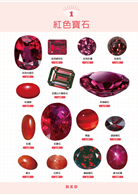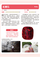 ◎將寶石分為紅、粉紅、橙、黃、綠、藍等11種顏色,分類介紹各種寶石所含有的元素比例、特性、原石模樣,並標示其硬度、損壞難易度等資訊。