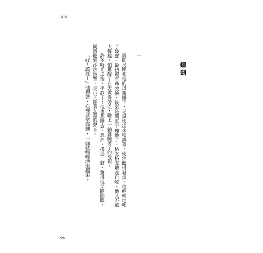 「聽哪!」她嚴肅地說,「你的父親原是一個鑄劍的名工,天下第一。他的工具,我早已都賣掉了來救了窮了,你已經看不見一點遺跡;但他是一個世上無二的鑄劍的名工。二十年前,王妃生下了一塊鐵,聽說是抱了一回鐵柱之後受孕的,是一塊純青透明的鐵。大王知道是異寶,便決計用來鑄一把劍,想用它保國,用它殺敵,用它防身。不幸你的父親那時偏偏入了選,便將鐵捧回家裡來,日日夜夜地鍛煉,費了整三年的精神,煉成兩把劍。