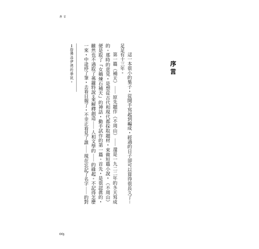現在才總算編成了一本書。其中也還是速寫居多,不足稱為「文學概論」之所謂小說。敘事有時也有一點舊書上的根據,有時卻不過信口開河。而且因為自己的對於古人,不及對於今人的誠敬,所以仍不免時有油滑之處。過了十三年,依然並無長進,看起來真也是「無非〈不周山〉之流」;不過並沒有將古人寫得更死,卻也許暫時還有存在的餘地的罷。