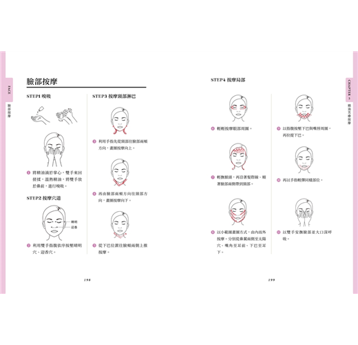 ▎消除水腫x護膚保養的精油按摩透過精油,搭配專業芳療師的按摩手法,讓效果更加乘。圖片解說臉部、腿部、胸部等部位的按摩步驟,讓大家在家即能自行操作。
