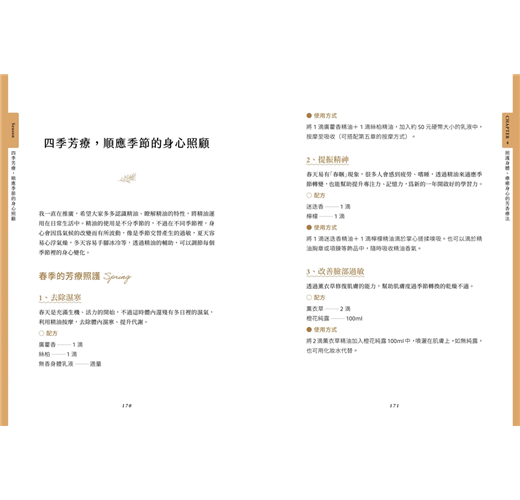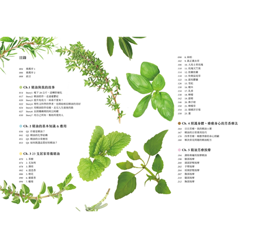 這些年來,接收到許多朋友的回饋,每一句說出口的話語、每一則傳送的訊息,對我訴說的感謝,我也都銘記在心。我與我的夥伴們在我所堅持的健康有機原則下一起打拼,彙整出一條遠大且有力量的洪流,這些全都是我的寶藏及成長的養分,在這本書裡,我想好好地將我珍藏多年的寶藏,讓這些飽含「愛」及「感恩」的精油分享給大家。