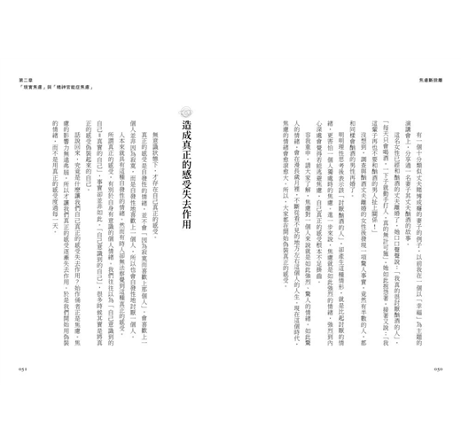 「焦慮會限制成長與認知,限縮情感生活的範疇。而且情緒健康(emotional health)等同於自我認知的程度。因此釐清焦慮,進而拓展認知,壯大自我,才是實現情緒健康之道。」