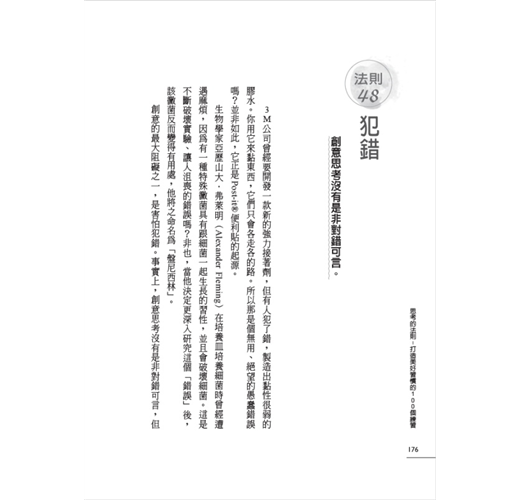 這是創意思考的大敵。正因為擔心會弄壞、搞砸、犯錯,害我們不敢大膽實驗,以致放棄了創意。在1920年代,亞歷山大?弗萊明並非唯一從事細菌培養的科學家。許許多多科學家都犯著相同的「錯誤」,而且他們一向都是依照從小就學會的方式處理錯誤──丟掉、掩飾、擺脫它們,然後重新開始。我無法說出這些科學家的大名,因為他們沒有人發現盤尼西林。