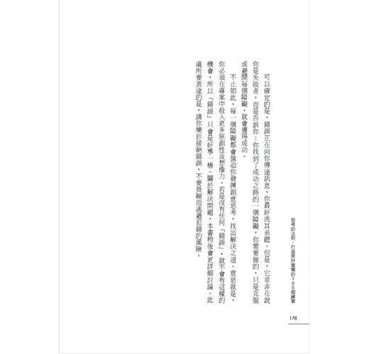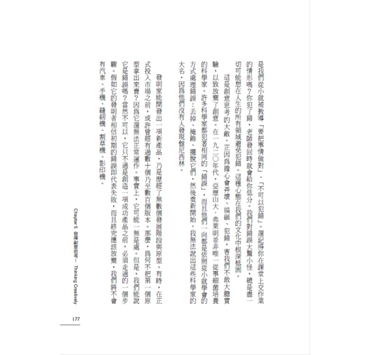 創意的最大阻礙之一,是害怕犯錯。事實上,創意思考並沒有是非對錯,但是我們從小就被教導「要把事情做對」、「不可犯錯」。還記得你在課堂上交作業的情形嗎?你犯了錯,老師發還時就會給你低分。我們對錯誤大驚小怪,總是盡一切可能想在人生的所有領域避免犯錯。這種心態在我們的文化中根深柢固。