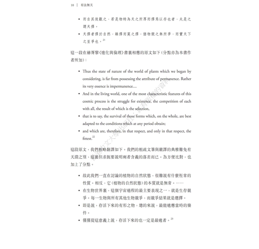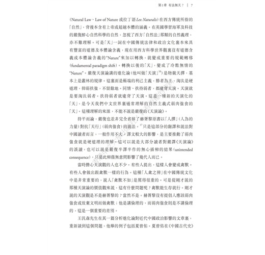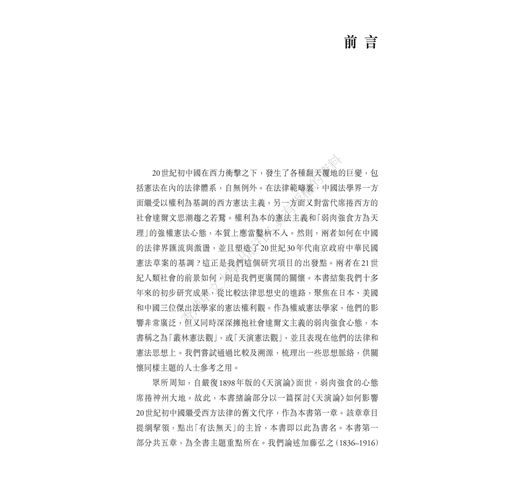 本書從比較法律思想史的進路,聚焦20世紀前期日本、美國、中國三位憲法巨擘─加藤弘之、霍姆斯及吳經熊的憲法權利觀,探索他們如何處理這兩種思想之間的張力,以達到自己安身立命的歸宿。透過《天演論》對中國繼受西方法律的影響、加藤弘之「進化論」為明治憲法的背書、霍姆斯對天賦人權的徹底否定,到吳經熊歸宗霍姆斯並在中國推廣「有法無天」的天演格局憲法權利觀,作者展示了「叢林憲法觀」如何在天、人、法三者之間互相激盪,並在二戰前的日本、美國和中國佔據上風。