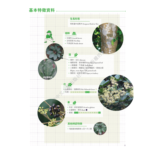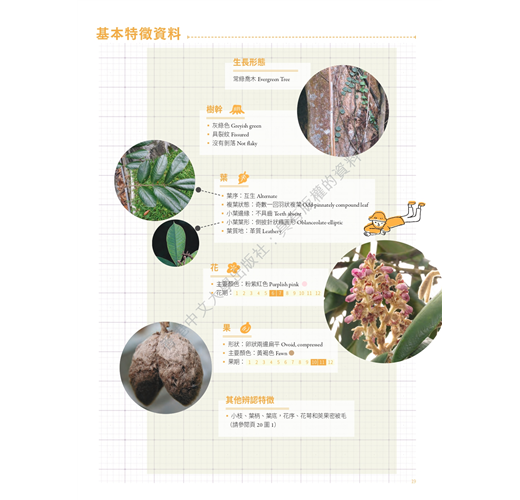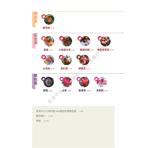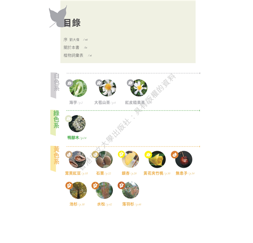 冬季是植物葉色轉化最明顯的季節,因此本冊除了冬季開花的8個品種,花色包括白、綠、黃、紅和紫等色系;9個結果的品種,果色包括黃、紅和橙等色系之外,還收錄7個具顯著葉色的品種,包括黃和紅等色系,全冊共載24種。