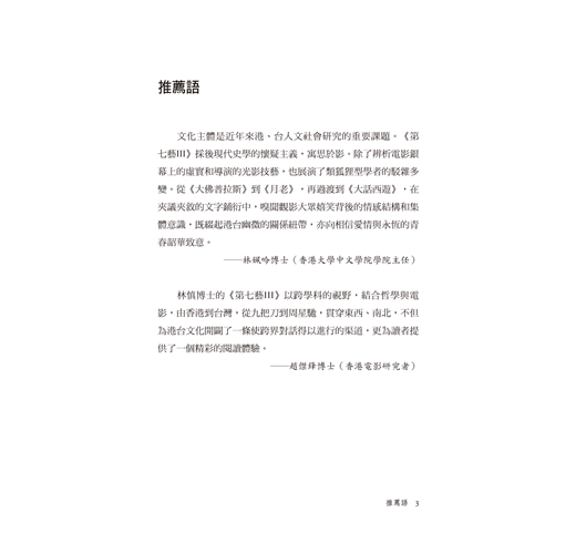 「文化主體是近年來港、台人文社會研究的重要課題。《第七藝III》採後現代史學的懷疑主義,寓思於影。除了辨析電影銀幕上的虛實和導演的光影技藝,也展演了類狐狸型學者的駁雜多變。從《大佛普拉斯》到《月老》,再過渡到《大話西遊》,在夾議夾敘的文字鋪衍中,嗅聞觀影大眾嬉笑背後的情感結構和集體意識,既綴起港台幽微的關係紐帶,亦向相信愛情與永恆的青春韶華致意。」──林姵吟博士(香港大學中文學院學院主任)